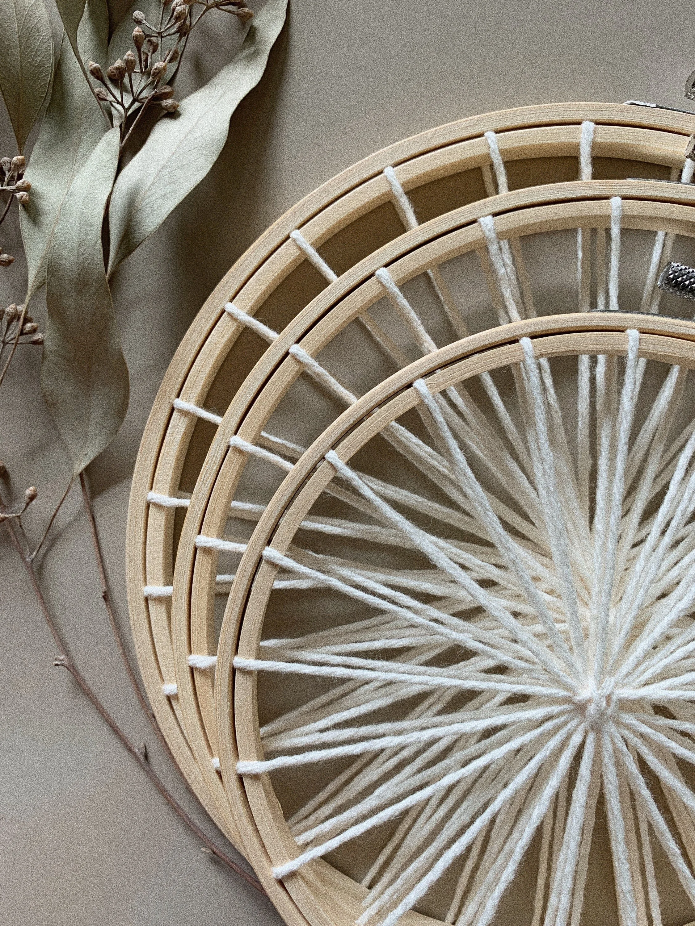 You asked for larger warped hoop options, so here you are! This listing is for a set of three warped hoops intended for weaving. It includes one 6” hoop, one 7” hoop, and one 8” hoop (3 hoops total). Made from bamboo hoops and white cotton string.